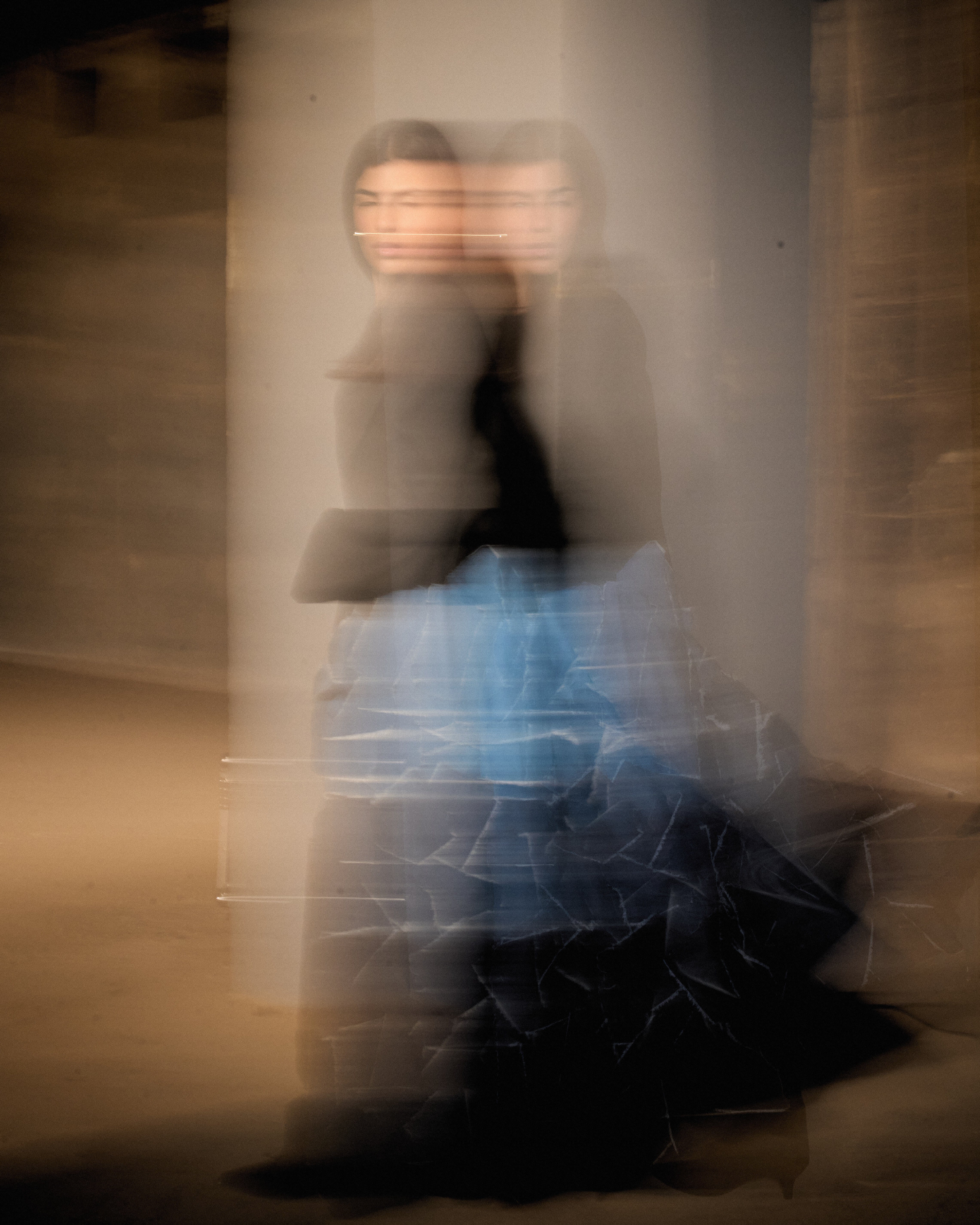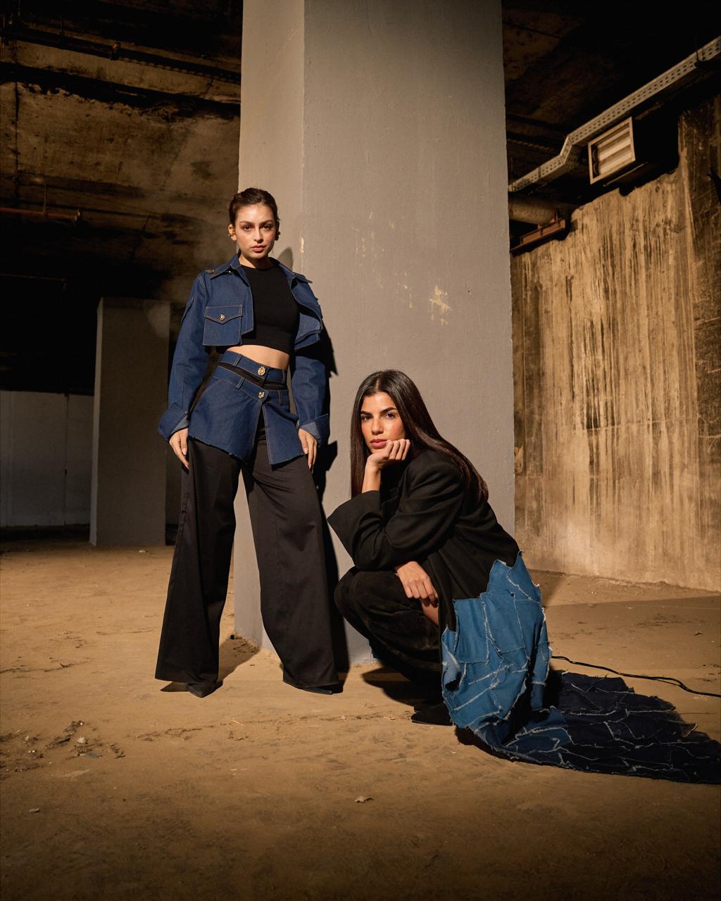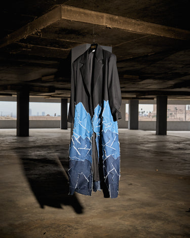 A long, black suiting fabric coat adorned with three shades of blue denim patches that extend from the waist to the hem.
