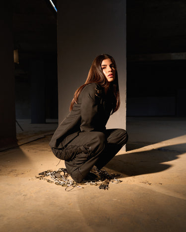 This black suit ensemble comprises a jacket with shoulder slits secured by a pin and side lacing. The set is complemented by wide-leg trousers featuring lacing on both leg sides.