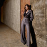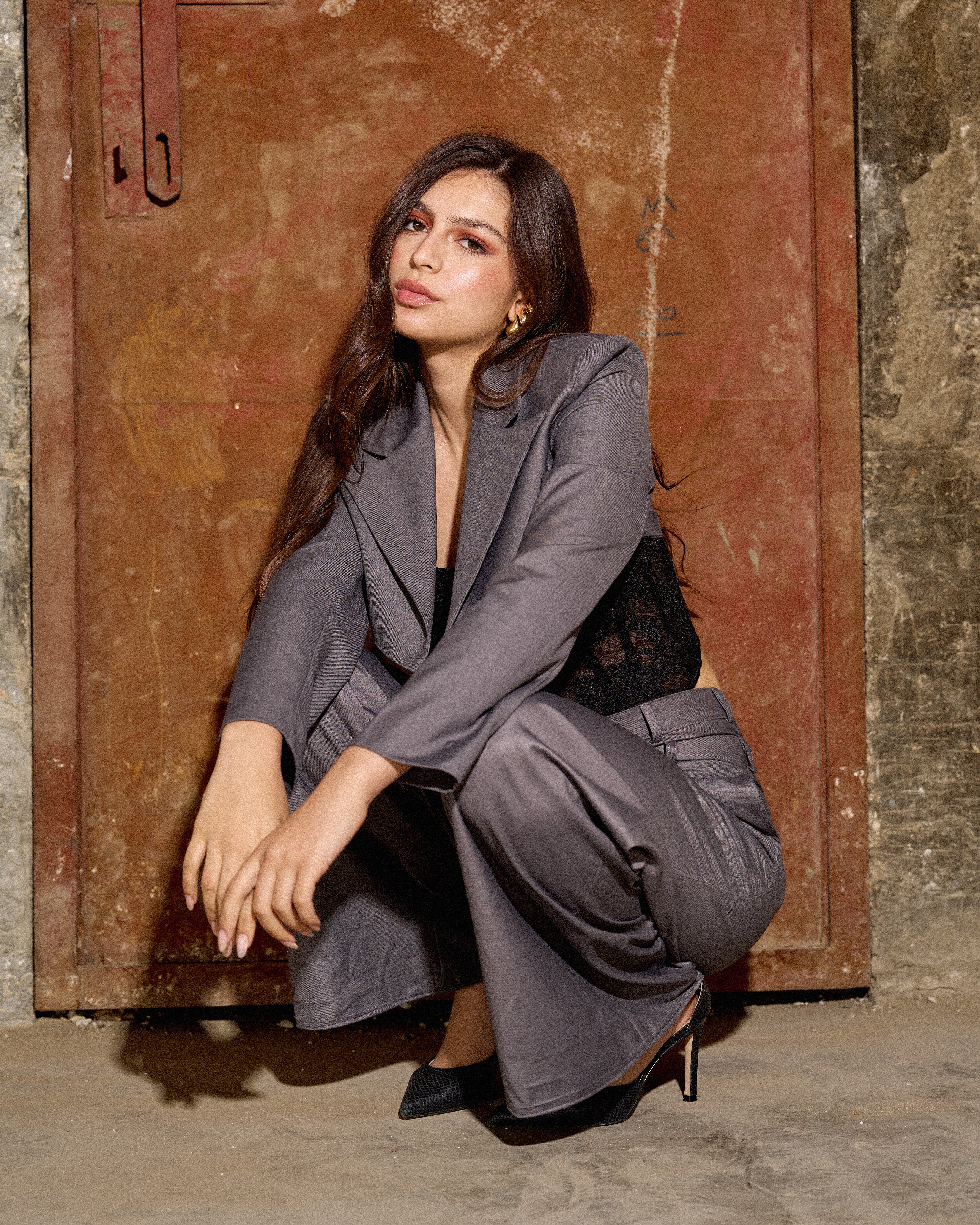 A modern gray three-piece suiting set featuring a cropped blazer, wide-leg double-waisted pants, and a lace corset top. This ensemble combines sharp tailoring with feminine detail, creating a powerful, structured look with a refined edge.